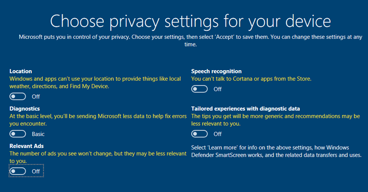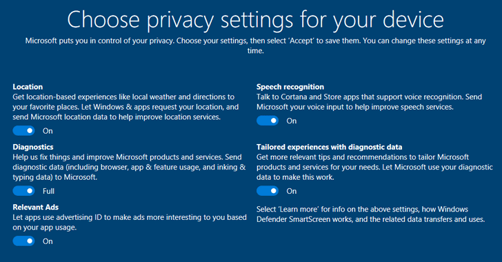 在升級到 Creators Update 的過程中,你會看到一個新的隱私設定視窗,要你勾選以下功能: