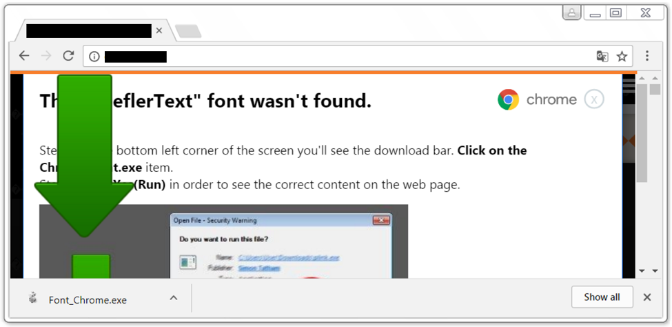 受害劇本分成兩種情境。微軟 IE 用戶會看到假的防護警示訊息以及假的技術支援電腦。而使用 Google Chrome 的人就會看到 Hoefler Text 提醒訊息,誘騙使用者下載偽造成 Font_chrome.exe 的惡意程式,Duncan 說。