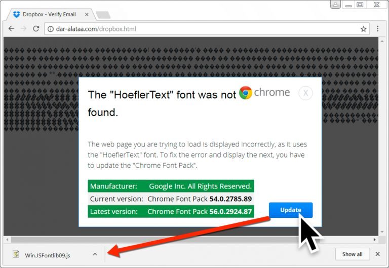 然後用戶也會看到類似的 Hoefler Text 字型下載提示訊息。同樣的,點入更新鍵後,用戶電腦即載入 Win.JSFontlib09.js 的 JavaScript 檔,該檔案會下載安裝 Locky 勒索軟體變種,叫做 Lukitus 。