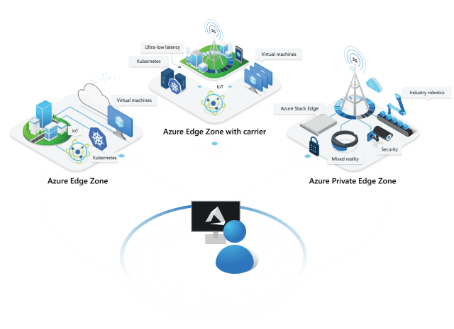 微軟的 Azure Edge Zones 分二種。一是結合電信業者的 Azure Edge Zones 。美國電信業者 AT&T 已推出達拉斯 Edge Zone,計畫今年春天再在洛杉磯推出。此外其他國家的電信業者,如阿聯電信(Etisalat)、 NTT 、 Proximus 、 Rogers 、 SK Telecom 、 Telstra 和 Vodafone 等也會推出 Edge Zone 服務。