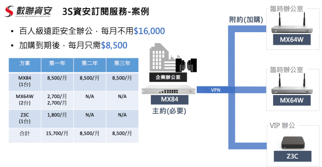 - 資安投資費用:透過每月月付方式,將傳統資安高額投資成本支出(CAPEX)轉化為企業營運費用(OPEX),降低一次性大筆投資金額,無須擔心資安投資被資產綁定的情況。有效解決過往企業經常因為企業營運考量而發生預算排擠,屈就於預算下選擇降低規格或犧牲防護周全性的情況。