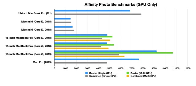 雖然 M1 在 Affinity Photo 測試不敵 16 吋 MacBook Pro,但 M1 整合式 GPU 還是超越 2 台 15 吋 MacBook Pro 使用的 Radeon Pro 580X 和 Intel UHD Graphics 630 。