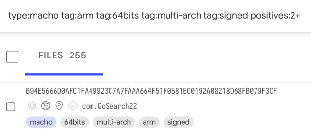 這款 App 去年 11 月由 Apple 開發人員 ID hongsheng_yan 簽章。不過該憑證已經被蘋果吊銷,因此不確定是否經蘋果公證。不過也因為憑證被吊銷,因此 GoSearch22 現在也無法在 macOS 上執行,除非獲得另一個開發人員的簽章。但是,在遭到取消憑證前這款 App 已成功感染了 macOS 用戶。