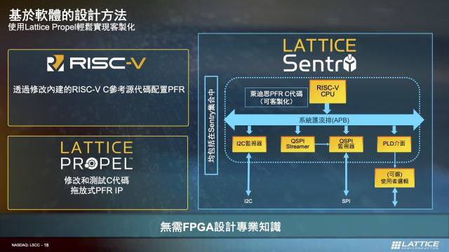 在軟體開發方面,支援 Lattice Propel Builder 與 Propel SDK 。前者是一款視覺化 UI 介面,可透過模組拖曳的方式在 Lattice FPGA 硬體上開發軟體的環境,而後者是使用 C code 進行編寫的 SDK 工具,簡化硬體與軟體方面的設計。