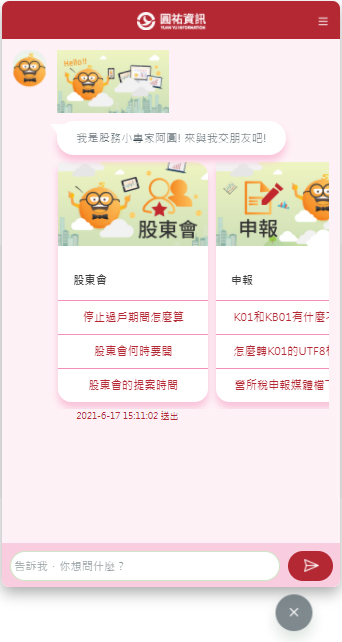 客戶可隨時在圓祐資訊官網或登入 StockTime 股務管理系統找到阿圓,諮詢各種股務作業問題,股務博士阿圓精通各項股務專業知識,擁有超過上千題的股務常見問題,例如:輸入「股東會」,阿圓會快速提供「股東會何時開」,「股東會是否要錄音錄影」等相關常見問題;且採用圖卡、選單等生動活潑互動方式,讓專業及法令問題口語化,創造良好的 AI 客服機器人 (Chatbot) 服務體驗。