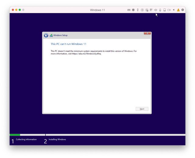 為了達到測試目的,也讓目前還在用 PD16 的讀者瞭解情況。筆者用 Apple M1 Mac mini 特地在 PD16 上嘗試安裝 Windows 11,結果是無法安裝。先是無法辨識 Windows 的版本,筆者手動指定 Windows 10,最後進到 Windows 11 安裝畫面時,顯示無法滿足最低需求,安裝被迫中斷。原本以為是 PD16 沒有 TPM 支援,所以筆者升級 PD17,順利完成安裝 Windows 11 。安裝之後想要測試一下 TPM 的開關,後來看了官方文件才知道 TPM 預設是沒有加入到虛擬機內。然後現在的 Windows 11 預覽版,也並非一定要有 TPM 。所以目前沒有啟用 TPM 的 PD17 是可以順利安裝 Windows 11 預覽版,相信就算是標準版 PD17 也可以裝。