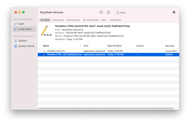 TPM 以硬體實做時,是固定的密碼金鑰生成器,所以使用者再怎麼重裝系統,一樣可以解密被該 TPM 加密的硬碟。不過若是虛擬化後,軟體模擬就難免遇到變動,後續資料解密讀取會有問題。 PD17 把 TPM 密鑰讓 macOS 的鎖匙圈 (Keychain) 負責管理,進去 Keychain 後可以匯出 TPM 的配置,方便轉移虛擬機器時同時匯入備份的 TPM,避免虛擬磁碟無法解密的問題。