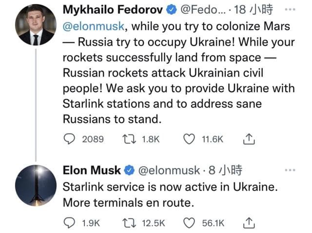 烏克蘭副首相暨數位轉型部長 Mykhailo Fedorov 透過 Twitter 向馬斯克 (Elon Musk) 請求協助。周日馬斯克指出,Starlink 服務現已在烏克蘭啟用,更多的終端基地台還在路上。