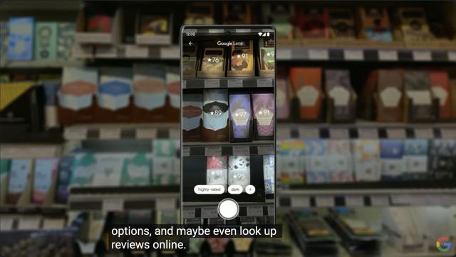另一項功能是關於 Google Lens,名為場景探索 (Scene Exploration),你可以用它來掃瞄超商內某一商品走道,尋找例如巧克力等商品,它的 AR 功能會在螢幕上顯示商品資訊。本功能也會今年內推出。