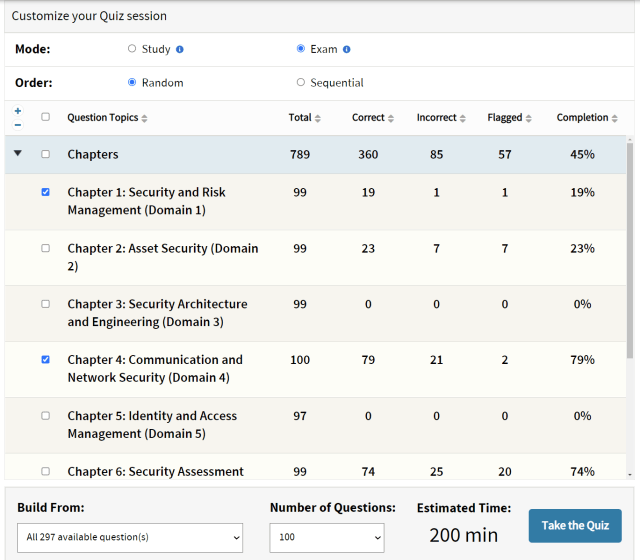 越到後期接近考試,每次連續答題的機會都很寶貴,為了增強章節與八大領域的覆蓋率。以每次作答一百題為例,建議選擇二到三個領域的題目。而且選擇的領域建議差別越大越好,例如把通訊網路安全架構、風險管理與軟體開發安全湊在一起作答。結合管理與技術面的題目,在考試時隨時切換思考狀態。