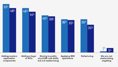 然而,當金融產業在數位化轉型的道路上競速時,他們當中許多還在與傳統的 IT 流程戰鬥,這些流程在速度與靈活性上仍然無法跟上步伐。重大的變革需要採行現代化方法,從 API 到現今的微服務、新用戶介面等組件,今年的調查中更發現,超過三分之一的金融服務受訪者已經採用網站可靠性工程 (SRE) 實踐,來處理基礎架構與作業問題,以提高現代應用程式和組件的開發與部署的速度、自動化和敏捷性,以管理當今分佈式架構中的遙測、資料和應用程式安全性和交付技術。