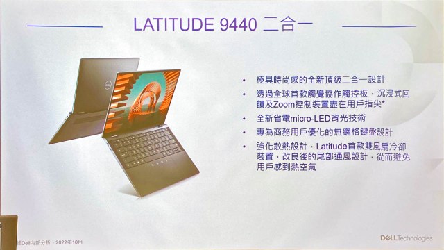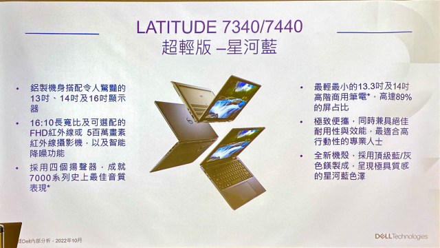 Latitude 7000 系列則推出 7340/7440 Ultralights 款式,為全球最輕的 13 吋與 14 吋高階商用筆電,機體重量約在一公斤上下。全機機殼採用鎂合金打造,並加裝 500 萬像素攝影機與 5G 通訊功能,以及智慧語音降噪功能,提升視訊會議的語音品質。徐士惠表示 Latitude 7340/7440 的智慧語音降噪是透過軟體運算的方式實現語音降噪的能力。