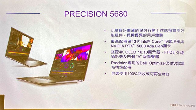 Dell 去年推出 14 吋工作站筆電,今年推出的 Precision 5480 則進一步提升繪圖晶片效能,也增加了 16 吋的 Precision 5680 行動工作站,配備 Intel Core i9 處理器 (45W) 、 64Gb DDR-5 記憶體與 Nvidia RTX 5000 Ada Generation 繪圖晶片。