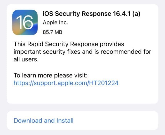 在那次 WWDC 之後將近一年,並在去年 9 月發布 iOS 16 七個多月後,蘋果公司終於發布了快速資安回應更新。該更新適用於執行版本 16.4.1 的 iOS 和 iPadOS 設備,以及執行版本 13.3.1 的 Mac 電腦,該更新會在作業系統版本後面添加一個 (a) 表示已安裝。