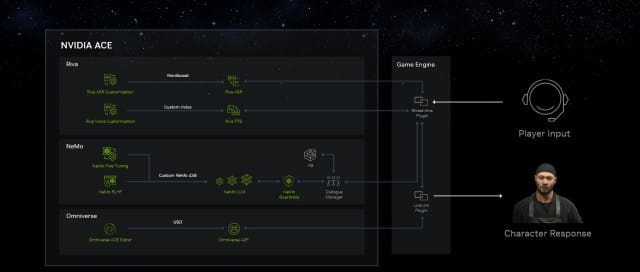昨日在台北 Computex 2023 開幕演說中,Nvidia CEO 黃仁勳公佈 AI 模型訓練服務 ACE for Games,具備自然語言對話、聲音配合臉部表情,以及文字轉語音(或語音轉文字)的能力,讓電玩角色活靈活現地出現。黃仁勳並展示了一段電玩影片,當中經營一家拉麵店的非玩家角色 (non-player character, NPC),名為 Jin,可在人類玩家以語音提問時以逼真的人聲對答如流,並且也符合 NPC 的故事背景(江湖中的拉麵店)。