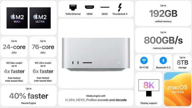 新版 Mac Studio 是蘋果最強大的 Mac 電腦,提供 M2 或 M2 Ultra 兩種晶片版本。最多(M2 Ultra)可提供 24 核 CPU 及 76 核 GPU 。和 Intel-based iMac 相比,M2 、 M2 Ultra 晶片版本 Mac Studio 效能分別可提升到 4 倍或 6 倍,而執行 Neural Engine 速度也提升 40% 。執行影像編碼速度比前一代 M1 Max 機種快 50%,並支援 22 道 8K pro res 影片串流。