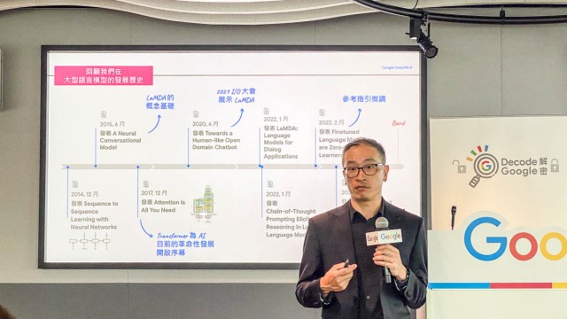 「在當時,所有的 AI 或語言模型都是分工合作的概念,像是翻譯和摘要都有專門的模型。然而,現在的發展趨勢是將所有功能放在一個大型語言模型中,因此出現了 LaMDA 這種可以執行多個任務的模型。」紀懷新解釋:「因此,Google 於 2022 年在 I/O 大會上發表了 LaMDA 模型,以 137 億個參數預先訓練,更重要的是這個 LLM 模型知道如何使用 Google 搜尋引擎。」