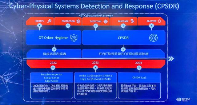 TXOne Networks 全球商業賦能暨大中華區業務部副總裁李育全表示針對 OT 環境的特性,TXOne Networks 推出 OT 原生虛實整合系統偵測及回應 (Cyber-Physical System Detection and Response, CPSDR) 技術,強調以資產為中心的保護策略,包括機器學習和資料分析,以建立一個全方位的資安威脅偵測系統,並將注意力放在端點與網路防護方案上。