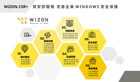 - 全方位資安即服務模式:整合 WiZON 資安即服務,提供全方位的資安監控、管理維運和專家支援服務,解決中小企業在資安專業技術、人力資源和投資方面所面臨的挑戰。 WIZON 創新推出 WiZON CSR+助中小企業完善 WINDOWS 安全保護關鍵資料