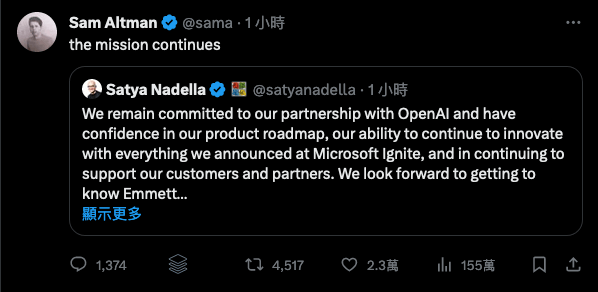 在 X(前身為 Twitter)的一篇帖子中,Sam Altman 承認他將加入微軟,並引用 Satya Nadella 的話:「使命繼續」。 Satya Nadella 回應了有關他如何看待 Sam Altman 在微軟的角色。「多年來,我們學到了許多關於如何給予創始人和創新者在微軟內部建立獨立身份和文化的空間,包括 GitHub 、 Mojang Studios 和 LinkedIn,我期待著讓你做同樣的事。」