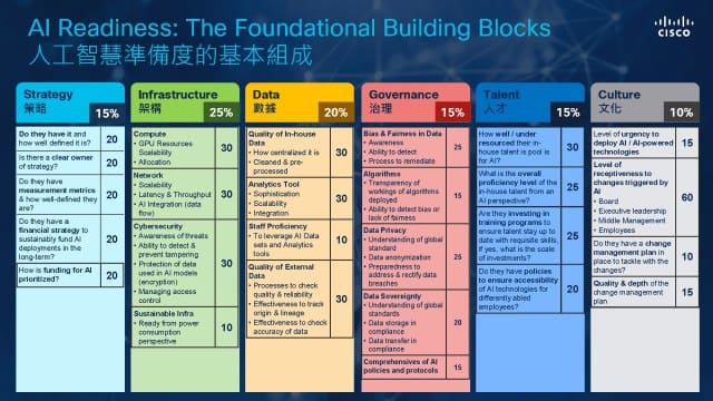 - 整體準備度:僅有 19% 的台灣企業被評估為充分準備部署和運用人工智慧,顯示大多數台灣企業在這方面仍需大力加強。