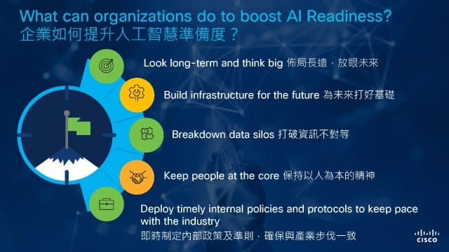 根據思科最新發布的《人工智慧準備度指數》調查顯示,只有 19% 的台灣企業充分準備好應用人工智慧技術。這項調查涵蓋全球 8,000 家企業,評估他們在人工智慧部署和運用方面的準備情況。結果表明,台灣企業在關鍵業務面向和架構上仍顯著不足,可能對短期內的企業發展構成風險。