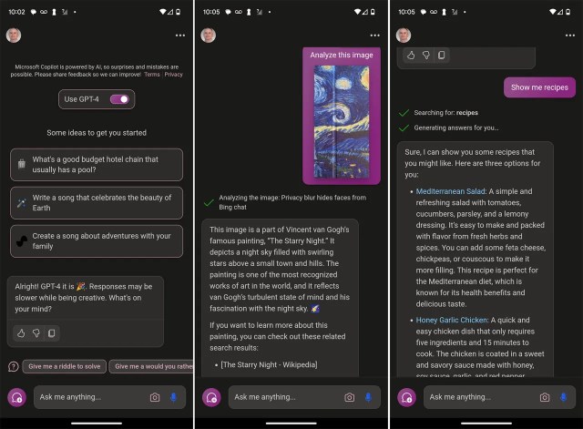 和微軟 Windows 或 Web 版一樣,Android 版 Copilot 讓用戶以自然語言下指令,完成搜尋、草擬郵件、摘錄文件,或是產生圖片,也可以上傳圖片叫 Copilot 分析。它的底層是 GPT-4 及 DALL-E 3,但你不需像 ChatGPT 一樣登入帳號。 Copilot 也提供關閉 GPT-4 、或明、暗色模式切換功能。