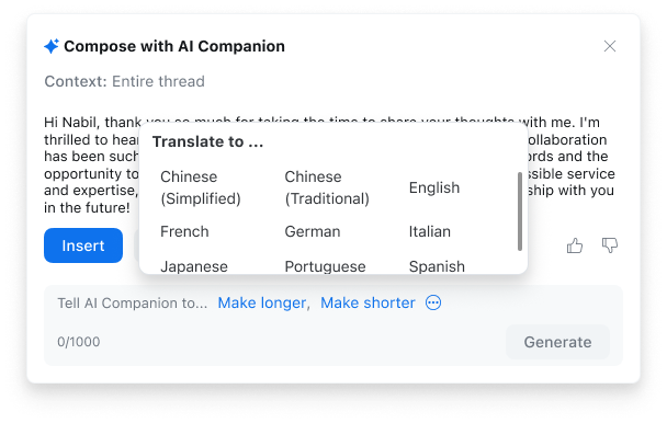 - 為協助全球團隊簡化協作與溝通,AI Companion 的會議摘要和會議問答功能現已擴大支援 36 種語言,並開放預覽版供用戶使用。