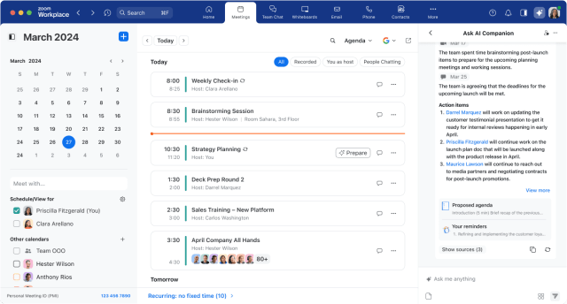Ask AI Companion 將能幫助用戶以全新方式在平台中與 AI Companion 互動,協助用戶從 Zoom Meetings 、 Mail 、 Team Chat 、 Notes 、 Docs 中蒐集、彙整、與共享資訊,有效提高日常工作效率。此外,Ask AI Companion 也能幫助用戶在開會前做足準備,如草擬議程等,並於會議結束後提供會議摘要、代辦事項,並總結聊天、信件紀錄與文件等。未來在用戶允許的前提下,Ask AI Companion 將能夠從選定的第三方應用程式中提取相關內容,進而提供更多幫助。