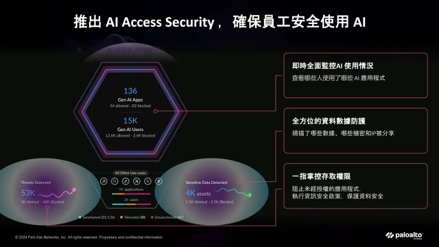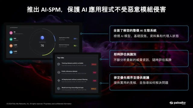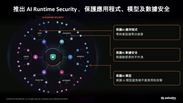 Palo Alto Networks 台灣技術總監蕭松瀛談到 Palo Alto Networks 的 AI 資安技術策略有三,首先是 AI 使用監控 (AI Access),這部分涵蓋了對企業內員工使用 AI 工具的監控,防止未授權的應用導致潛在的安全風險。其次是 AI 資安態勢感知 (AI Security Posture Management, AI-SPM),該技術能即時檢測惡意程式、釣魚攻擊等安全威脅,幫助企業維持其 AI 應用環境的安全。最後,AI Runtime Security 保護企業在 AI 應用開發過程中的安全,確保模型訓練資料不被毒化或外洩。