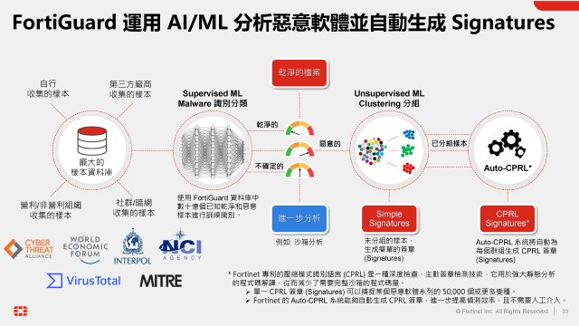 AI 引擎持續學習全球威脅情資,能即時辨識異常行為,並自動產生針對性的防禦策略;CPRL 技術則能快速產生涵蓋多達 5 萬種惡意軟體變種的特徵碼,大幅提升檢測效率與準確性。同時,FortiAI 還與 Fortinet 的安全織網平台 (Security Fabric) 無縫整合,支援多款資安工具,如 FortiAnalyzer 、 FortiSIEM 和 FortiSOAR,提供從威脅分析到自動化應對的全流程解決方案。