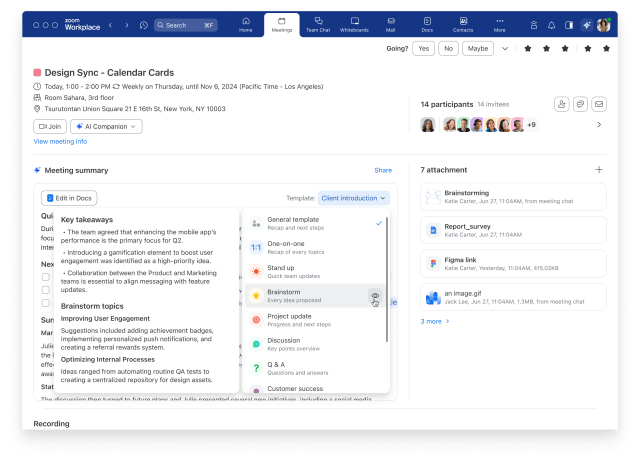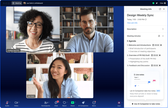 隨著全新代理式 AI 功能的加入,AI Companion 可幫助用戶更高效地完成工作、確認與執行任務、管理會議等。 AI Companion 的代理功能遍佈整個平台,協助用戶減少手動工作,讓他們能專注於最重要的事務。