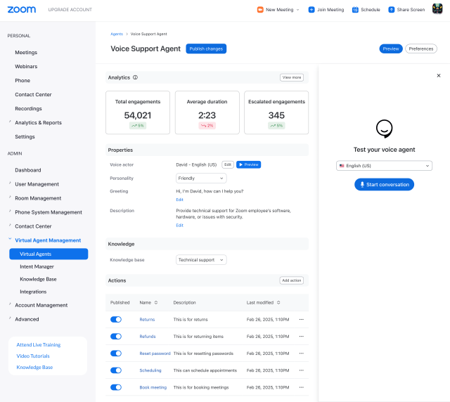 - Zoom Virtual Agent:透過具備代理式 AI 功能的全新生成式 AI 技術將推動自助式服務邁入下一階段。 Zoom Virtual Agent 將具備更自然的語氣,能夠處理更為複雜的問題,並代表客戶執行各項任務。為進一步擴展此功能,Zoom Virtual Agent 將支援語音與聊天頻道(預計於今年春季後期對特定客戶開放測試),為客戶提供 24 小時流暢且不間斷的體驗。