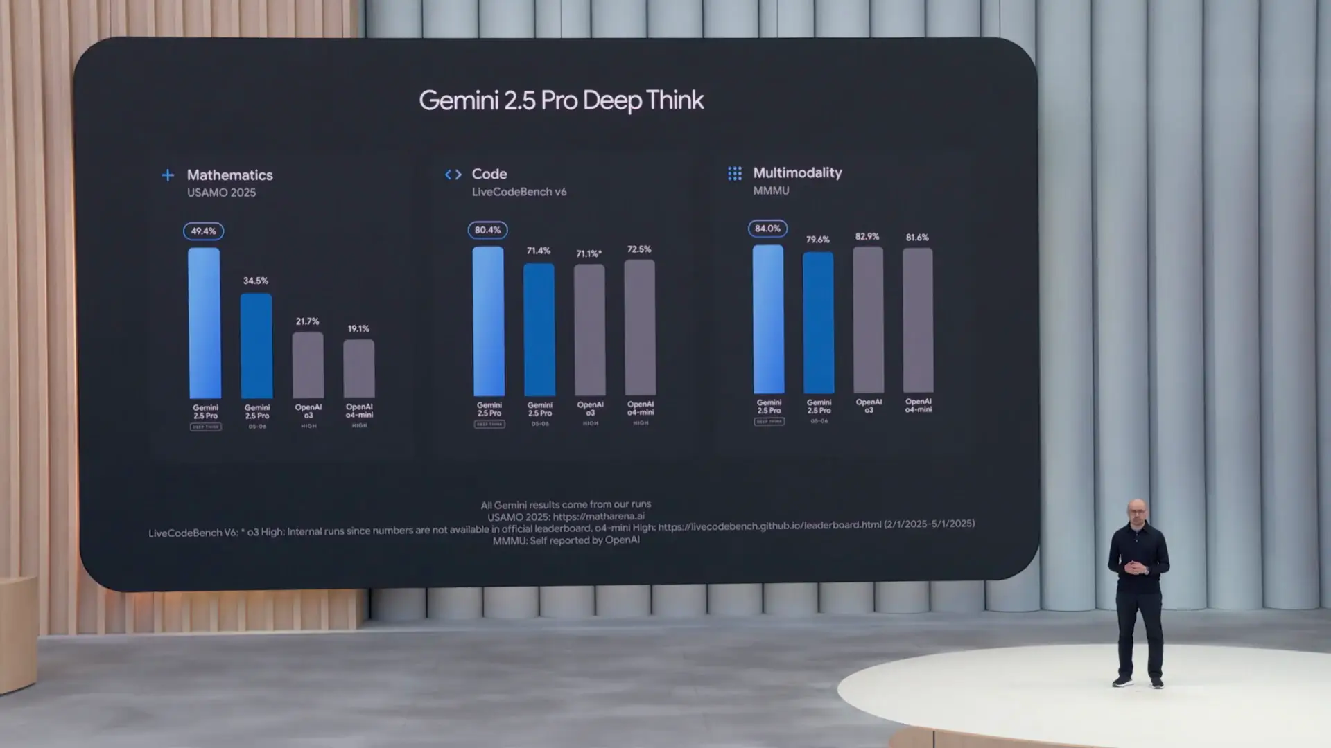 Deep Think 為 Gemini 2.5 Pro 模型的最進階推理模式,可在回應前考量多個問題,且在多項標竿測試中提升效能。 Googel 沒有提供細部說明,但可能和 OpenAI 的 o1-pro 及下一代的 o3-pro 模型一樣,可針對用戶問題搜尋網路資訊並匯整出最好的回覆。目前 Deep Think 透過 Gemini API 提供給信賴的測試人員,Google 說還會再做進一步安全評估才會正式推出。