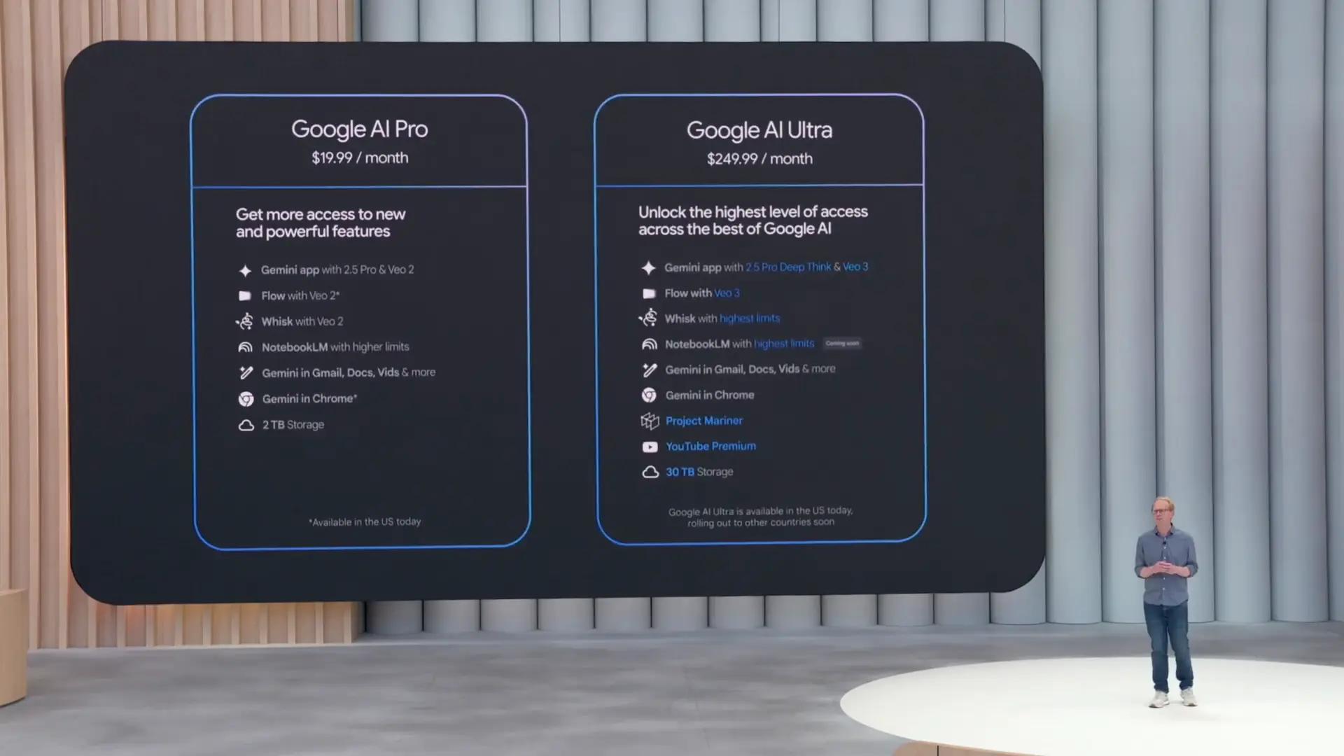 Gemini Ultra 方案含括 Google 最頂級的付費 AI 應用及服務,月費高達 249.99 美元,目前僅在美國推出。 Gemini Ultra 包含影片產生模型 Veo 3 、影片編輯應用 Flow 及之後才會推出的強大 AI 工具 Gemini 2.5 Pro Deep Think 模型。 Ultra 將提供用量最大的 NotebookLM 及影片混編後製 App Whisk 。 Ultra 訂閱用戶還能使用 Chrome 版 Gemini 聊天機器人、 Project Mariner 代理人、 Youtube Premium 及跨 Google Drive 、 Google Photos 、 Gmail 的 30TB 網路硬碟。