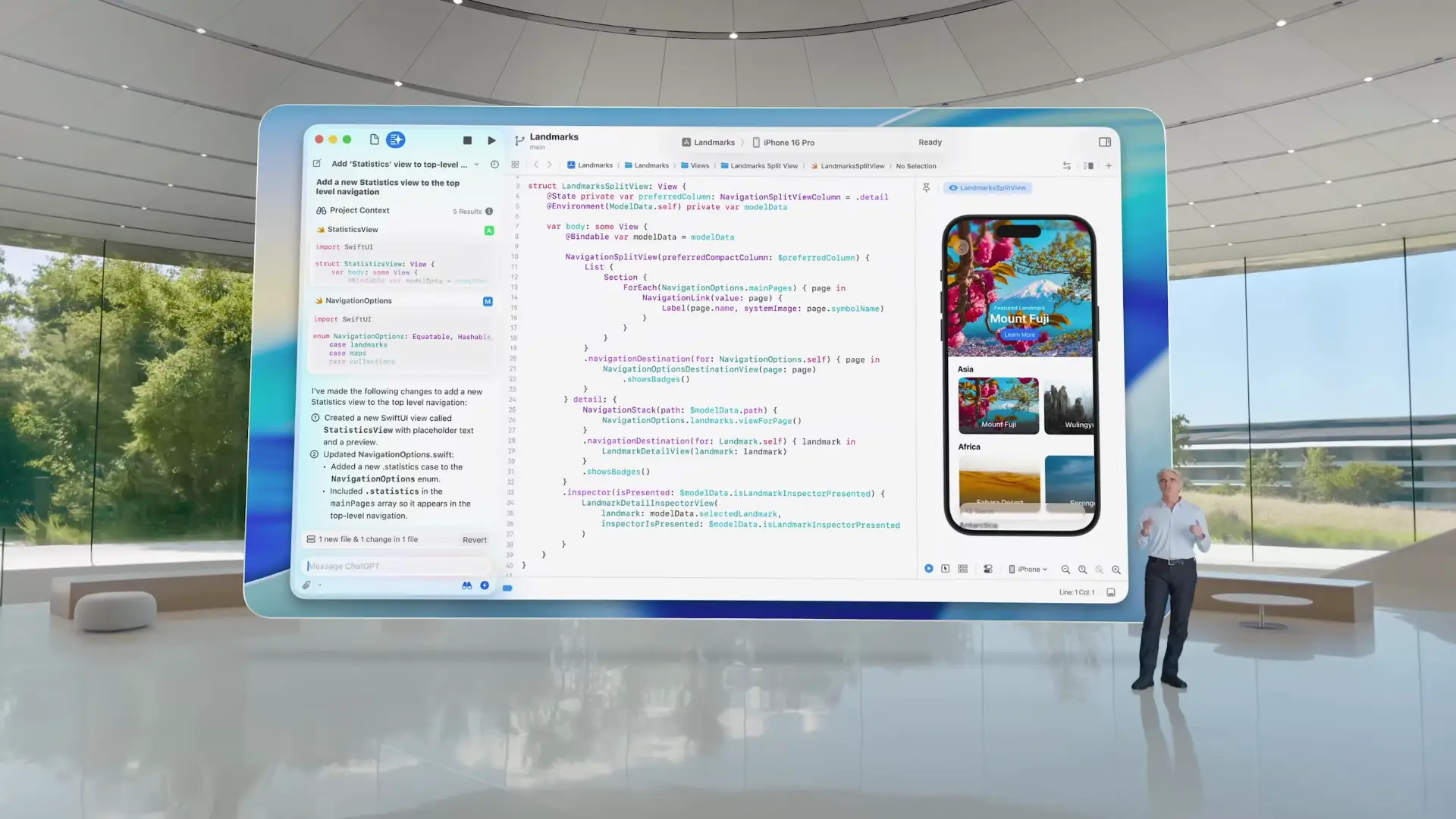 Xcode 26 大幅引入人工智慧輔助功能。 Xcode 現整合大型語言模型(如 ChatGPT),開發者可以直接在編輯器中連接 AI 模型來撰寫程式、生成測試和文件、修正錯誤等,或使用自己的 API 金鑰/本機模型來調整推薦方式。全新的 Coding Tools 功能則會在程式碼中提供原生操作建議(例如生成預覽、建立 Playground 、修正程式錯誤等),讓開發流程更加流暢。此外,Xcode 26 還改善了導覽介面與本地化 Catalog 的效率,並增強了語音控制功能,開發者可用語音輸入 Swift 代碼及完整操作編輯介面。