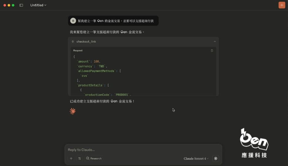 根據 NVIDIA 的第五份《金融服務業 AI 現況(State of AI in Financial Services)》年度調查報告顯示超過六成的受訪者表示 AI 已協助減少 5% 或以上的年度成本、近四分之一的受訪者正計劃使用 AI 創造新的商機和收入來源。 Oen 應援科技推出專為金流場景打造的對話式金流 MCP,透過自然語言即可直接操作金流 API,顛覆傳統需技術串接流程,實現「對 AI 說一句,金流 API 就能啟動」的全新體驗。從建立付款頁面的小任務、把 vibe coding 產品整合收費模式,到規劃會員訂閱制流程,用戶都能透過應援金流 MCP 輕鬆完成。