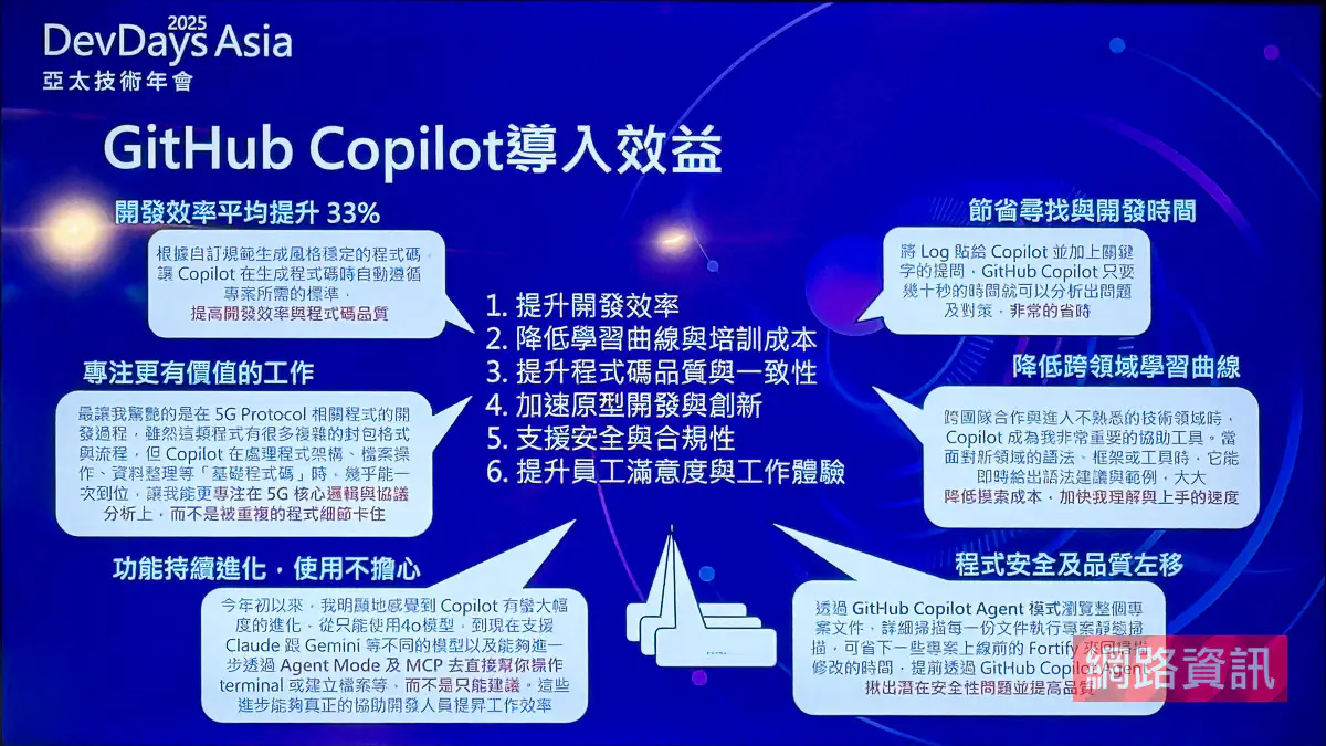 本屆大會除官方與產業高層外,更邀請 11 個台灣開發者社群共襄盛舉,包括 Agile.Taichung 、 PyLadies Taiwan 、 WordPress 台灣社群與 WiDS Taipei 等,展現社群力量在推動 AI 創新的關鍵角色。廣達電腦總管理處管理資訊中心處長李振忠分享,廣達運用 GitHub Copilot 成功縮短程式開發時間並提升研發效率;GitHub Star 暨微軟 MVP 謝政廷則以自身專案經驗,說明 Copilot 與 AI Agent 已重塑開發協作模式,啟發新一代工程師的學習方式。
