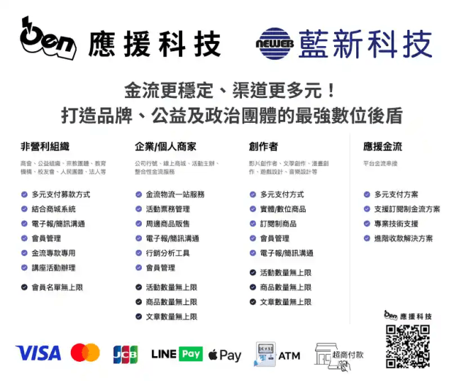 • 全方位線上整合平台: 專為品牌電商、公益組織、宗教團體,以及政治團體與各類創作者打造的一站式介面。涵蓋從募資頁面建立、活動售票管理、商品販售電商系統,乃至後端的倉儲物流串接,滿足複雜且多樣的線上營運需求。